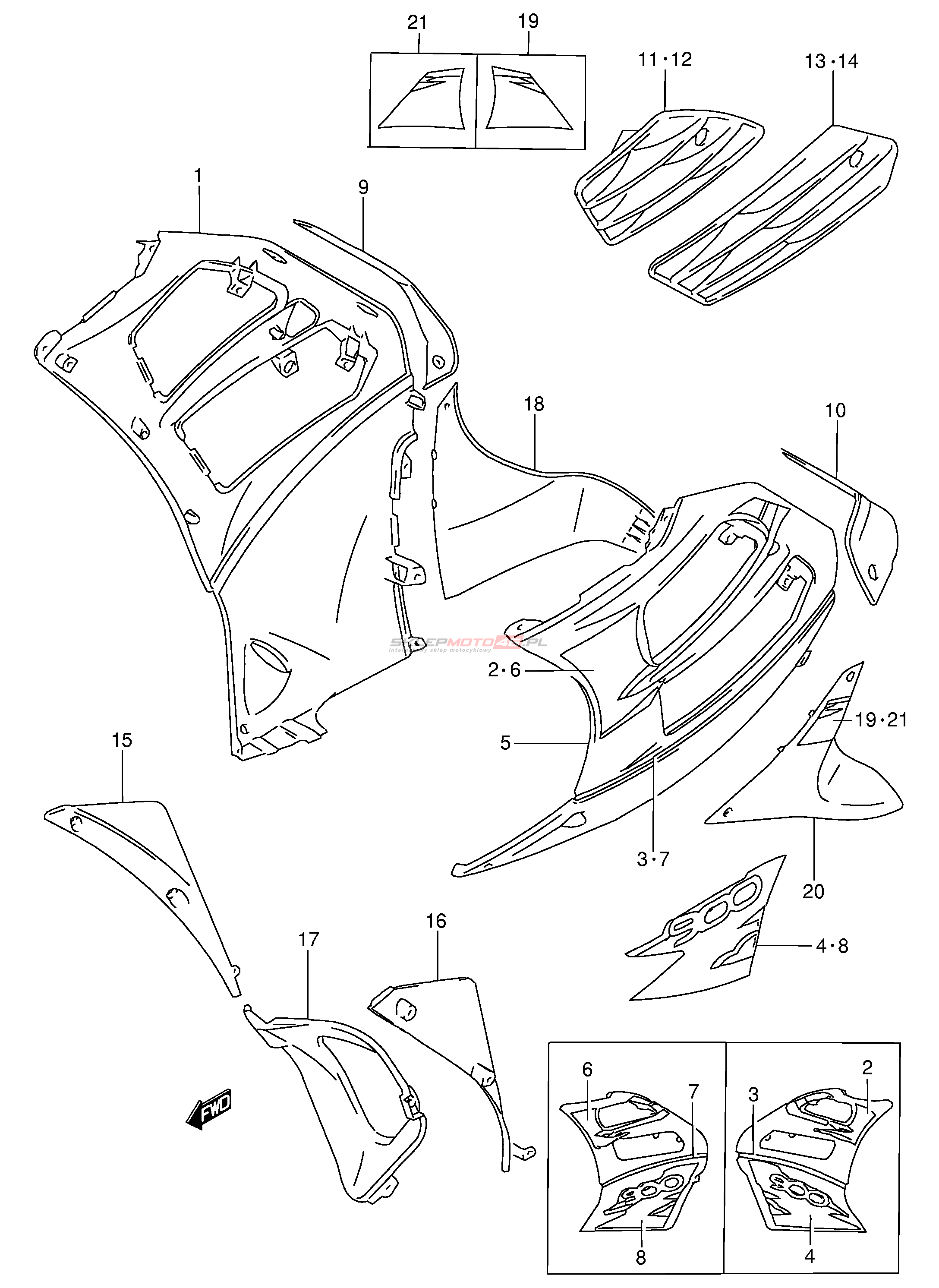 Wszystkie części widoczne na fiszkach to oryginalne części OEM Suzuki.
