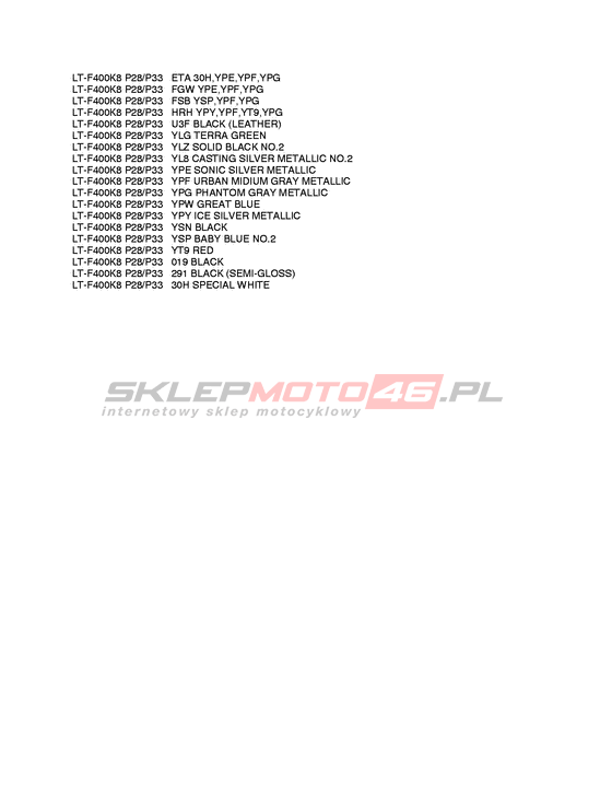 KARTA KOLORÓW LT-F400 KingQuad 400 2WD Model code LT-F400K9(P28/P33) K9 Engine Capacity 376 Year 2009
